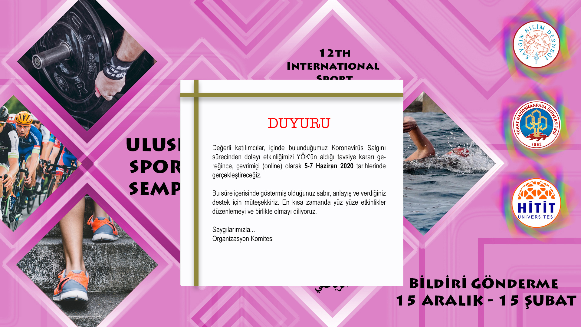 12. Uluslararası Spor Camiası Sempozyumu, daha önceki sempozyumlarda elde edilen birikimin geliştirilmesi ve bilginin daha geniş çevrelere ulaştırılması için 05-07 Haziran 2020 tarihlerinde YÖK'ün tavsiye kararına dayanarak çevrimiçi (online) gerçekleştirilecektir.